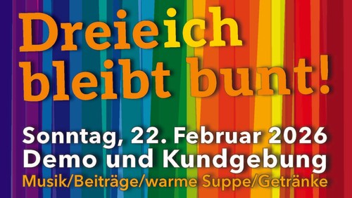 Unter dem Motto „Dreieich bleibt bunt!“ ruft ein breites Bündnis am Sonntag, 22. Februar, zu einer Demonstration mit anschließender Kundgebung in Dreieichenhain auf. Treffpunkt ist um 14 Uhr am Parkplatz des TSV Dreieichenhain in der Koberstädter Straße. Die Abschlusskundgebung beginnt um 15 Uhr an der Burg Dreieichenhain.