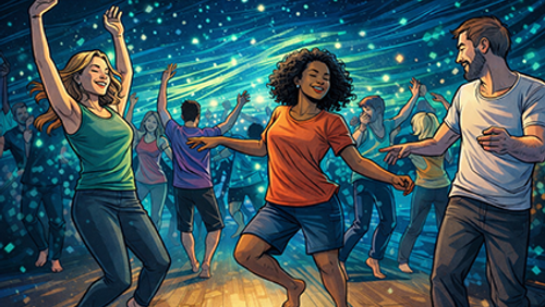 Musik hören, sich frei bewegen und einfach dem eigenen Rhythmus folgen – dazu ermutigt das Angebot FlowDance im Familienzentrum Die Winkelsmühle in Dreieich. An mehreren Samstagen im Jahr verwandelt sich der Saal im ersten Obergeschoss in einen Raum für Bewegung, Musik und Begegnung.