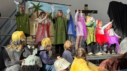Als die Engel schließlich die Auferstehung verkünden und das leere Grab sichtbar wird, wandelt sich die Stimmung. Die Kinder greifen die Botschaft auf, singen sie weiter – und tragen sie symbolisch in die Gemeinde hinein. Spätestens beim farbenfrohen Tüchertanz und dem fröhlichen Schlusslied „Ein Fest, ein Fest, ein Fest, wir feiern das Osterfest“ wird deutlich: Hier ist etwas gewachsen, das über die Woche hinausstrahlt.